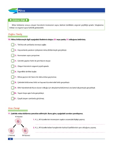 10. Mitoz bölünmeyle ilgili aşağıdaki ifadelerin doğru (D) veya yanlış (Y) olduğunu belirtiniz.