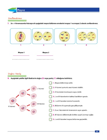 7. 2n = 4 kromozomlu hücreye ait aşağıdaki mayoz bölünme evrelerini mayoz 1 ve mayoz 2 olarak sınıflandırınız.