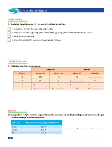 2. Dünya’nın cisimlere uyguladığı çekim kuvveti Ay’ın uyguladığı çekim kuvvetinden 6 kat daha fazladır.