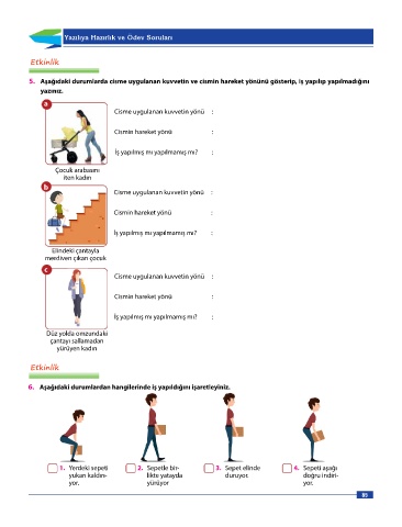 5. Aşağıdaki durumlarda cisme uygulanan kuvvetin ve cismin hareket yönünü gösterip, iş yapılıp yapılmadığını