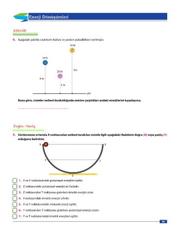 5. Sürtünmesiz ortamda X noktasından serbest bırakılan cisimle ilgili aşağıdaki ifadelerin doğru (D) veya yanlış (Y)