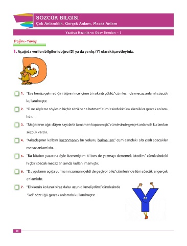 1. Aşağıda verilen bilgileri doğru (D) ya da yanlış (Y) olarak işaretleyiniz.