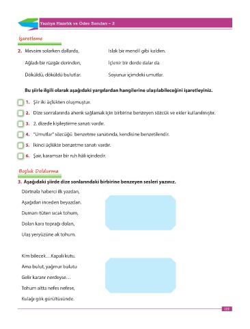 3. Aşağıdaki şiirde dize sonlarındaki birbirine benzeyen sesleri yazınız.