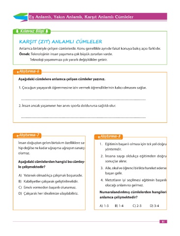 Eş Anlamlı, Yakın Anlamlı, Karşıt Anlamlı Cümleler