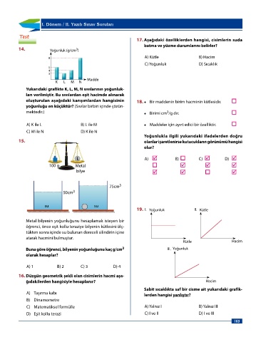 13. Aşağıdaki ifadelerin doğru (D) veya yanlış (Y) olduğunu belirtiniz. 19. I. Yoğunluk II. Kütle