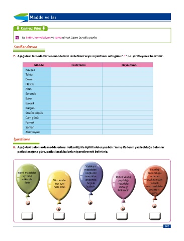 7. Aşağıdaki tabloda verilen maddelerin ısı iletkeni veya ısı yalıtkanı olduğunu ““ ile işaretleyerek belirtiniz.
