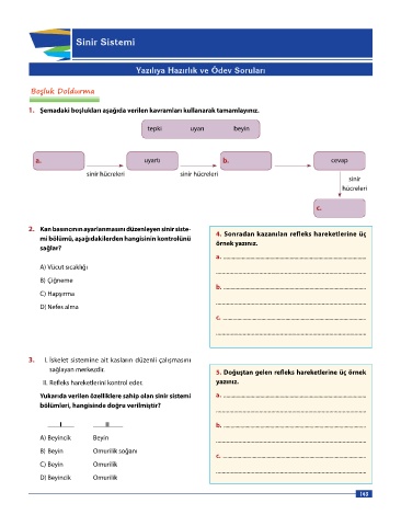 d. Reflekslerin oluşmasını ....................................... kontrol eder. 2. Kan basıncının ayarlanmasını düzenleyen sinir siste- 4. Sonradan kazanılan refleks hareketlerine üç