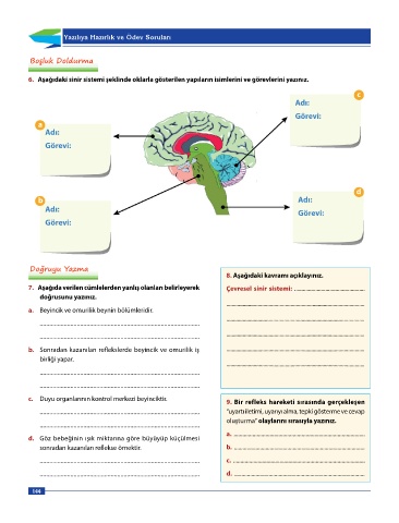 6. Aşağıdaki sinir sistemi şeklinde oklarla gösterilen yapıların isimlerini ve görevlerini yazınız.