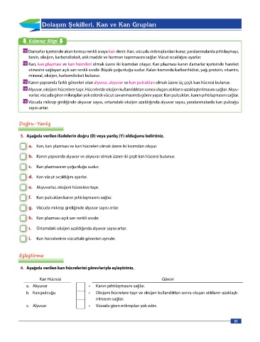 b. Küçük kan dolaşımında kan akciğerlere / karaciğere gönderilerek temizlenir. a. Kan, kan plazması ve kan hücreleri olmak üzere iki kısımdan oluşur.