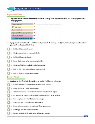 3. Aşağıda verilen ifadeler içinde yanlış olanları bularak, doğru halini boşluklara yazınız. 6. Aşağıda verilen durumlarda kanda sayısı artan hücre çeşidini (alyuvar, akyuvar, kan pulcuğu) yanındaki