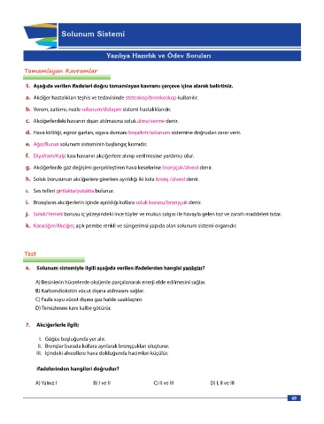 C) Ağız – Gırtlak – Yutak – Bronş – Soluk borusu - Alveol - Bronşçuk 6. Solunum sistemiyle ilgili aşağıda verilen ifadelerden hangisi yanlıştır?