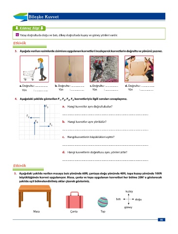 ya da yönünü, şeklini değiştirebilen etkiye kuvvet denir. 3. Aşağıda verilen resimlerde cisimlere uygulanan kuvvetleri inceleyerek kuvvetlerin doğrultu ve yönünü yazınız.