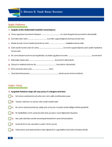 e. Bir cisme bileşke kuvvet ile eşit büyüklükte, zıt yönde uygulanan kuvvete ............................................................. kuvvet denir.