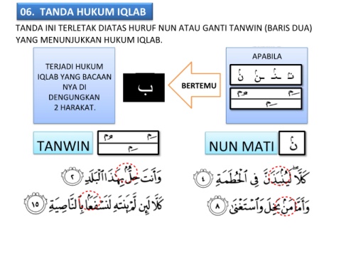 06. TANDA HUKUM IQLAB TANDA INI TERLETAK DIATAS HURUF NUN ATAU GANTI TANWIN (BARIS DUA) YANG MENUNJUKKAN HUKUM IQLAB. APABILA TERJADI HUKUM IQLAB YANG BACAAN NYA DI ب BERTEMU DENGUNGKAN 2 HARAKAT. TANWIN NUN MATI