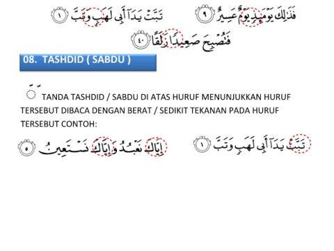 08. TASHDID ( SABDU ) ّ ّ ّ TANDA TASHDID / SABDU DI ATAS HURUF MENUNJUKKAN HURUF TERSEBUT DIBACA DENGAN BERAT / SEDIKIT TEKANAN PADA HURUF TERSEBUT CONTOH: KE