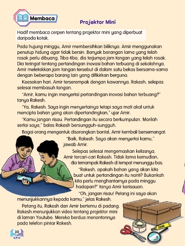Hadif membaca cerpen tentang projektor mini yang diperbuat