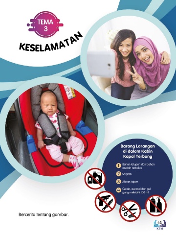 TEMA 3 Barang Larangan di dalam Kabin Kapal Terbang 1 Bahan letupan dan bahan mudah terbakar 2 Senjata 3 Alatan tajam 4 Cecair, aerosol dan gel yang melebihi 100 ml Bercerita tentang gambar. 43