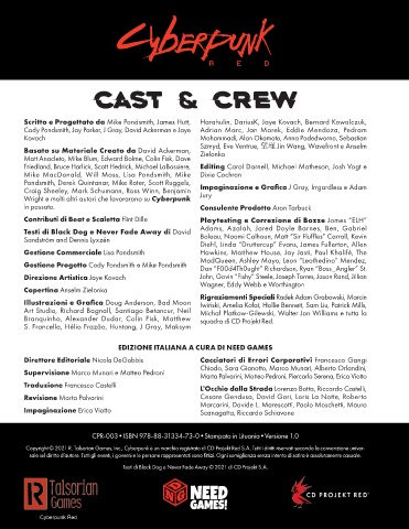 Copyright © 2021 R. Talsorian Games, Inc., Cyberpunk è un marchio registrato di CD Projekt Red S.A. Tutti i diritti riservati secondo la convenzione univer-
