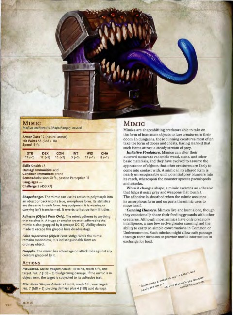 Shapechanger. The mimic can use its action to polymorph into The adhesive is absorbed when the mimic assumes