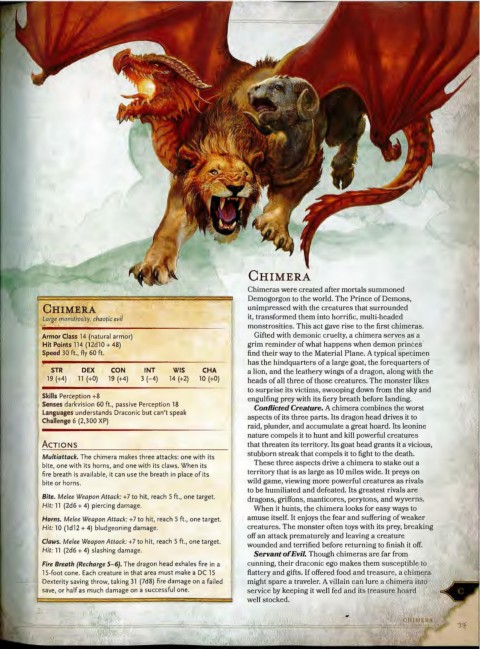 Armor Class 14 (natural armor) Gifted with demonic cruelty, a chimera serves as a