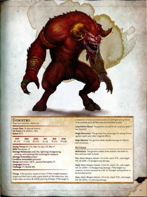 Damage Resistances cold, fi re, lightning; bludgeoning, Multiattack. The goristro makes three attacks: two with its