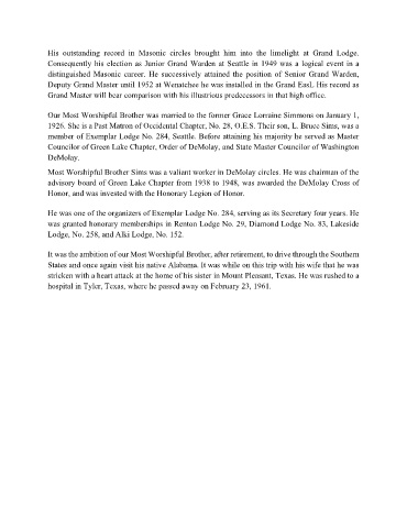 Most Worshipful Brother Sims was a valiant worker in DeMolay circles. He was chairman of the