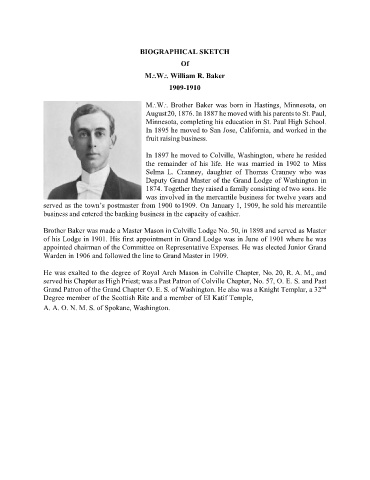 Brother Baker was made a Master Mason in Colville Lodge No. 50, in 1898 and served as Master