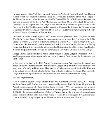 George Thomas Leslie was elected Junior Grand Warden at Grand Lodge in Spokane in 1989. He
