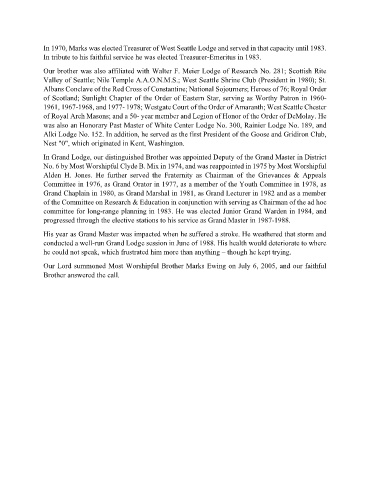In 1970, Marks was elected Treasurer of West Seattle Lodge and served in that capacity until 1983.