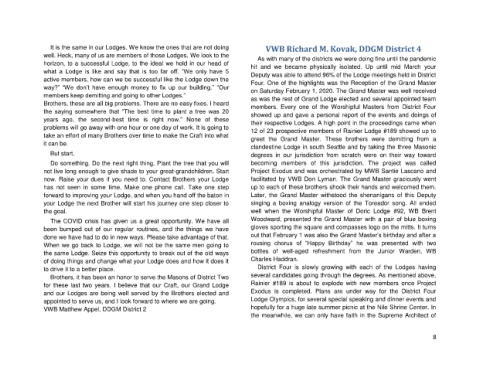 and our Lodges are being well served by the Brothers elected and Exodus is completed. Plans are under way for the District Four