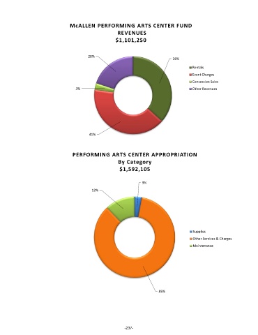 McALLEN PERFORMING ARTS CENTER FUND REVENUES $1,101,250 20% 36% Rentals Event Charges Concession Sales 3% Other Revenues 41% PERFORMING ARTS CENTER APPROPRIATION By Category $1,592,105 3% 12% Supplies Other Services & Charges Maintenance 85% -237-