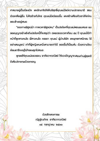 ศาสนาอยู่เป็นเนืองนิจ และรักษาจิตใจให้บริสุทธิ์คุณแม่มีแต่ความปรารถนาดี ชอบ