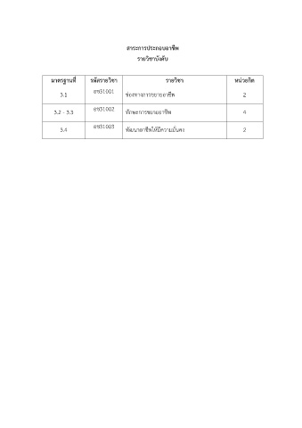 สาระการประกอบอาชีพ รายวิชาบังคับ มาตรฐานที่ รหัสรายวิชา รายวิชา หน่วยกิต 3.1 อช31001 ช่องทางการขยายอาชีพ 2 3.2 - 3.3 อช31002 ทักษะการขยายอาชีพ 4 3.4 อช31003 พัฒนาอาชีพให้มีความมั่นคง 2