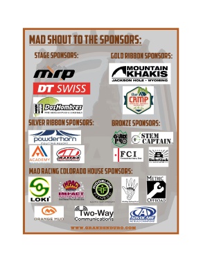 MAD shout to the sponsors: Stage Sponsors: Gold RIbbon Sponsors: Silver Ribbon Sponsors: BRONZE Sponsors: MAD RACING COLORADO HOUSE SPONSORS: WWW.GRANDENDURO.COM