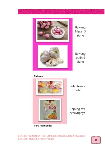 Bawang Merah 3 siung Bawang putih 3 siung Baluran: Putih telur 2 butir Tepung roti secukupnya Cara membuat: E-Modul Pengolahan Hasil Samping Serealia, Kacang-kacangan dan Umbi Menjadi Produk Pangan 33 33 33