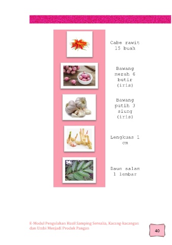 Cabe rawit 15 buah Bawang merah 6 butir (iris) Bawang putih 3 siung (iris) Lengkuas 1 cm Daun salam 1 lembar E-Modul Pengolahan Hasil Samping Serealia, Kacang-kacangan dan Umbi Menjadi Produk Pangan 40 4 0 40