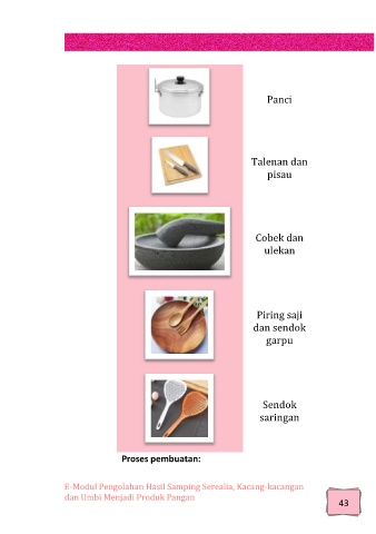 Panci Talenan dan pisau Cobek dan ulekan Piring saji dan sendok garpu Sendok saringan Proses pembuatan: E-Modul Pengolahan Hasil Samping Serealia, Kacang-kacangan dan Umbi Menjadi Produk Pangan 43 43 43