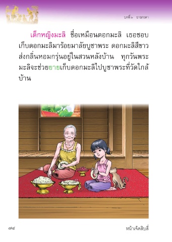 บทที่ ๖ ยายกะตา เด็กหญิงมะลิ ชื่อเหมือนดอกมะลิ เธอชอบ เก็บดอกมะลิมาร้อยมาลัยบูชาพระ ดอกมะลิสีขาว ส่งกลิ่นหอมกรุ่นอยู่ในสวนหลังบ้าน ทุกวันพระ ี มะลิจะช่วยยายเก็บดอกมะลิไปบูชาพระท่วัดใกล้ บ้าน 74 หน้าเจ็ดสิบสี่