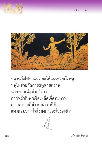 บทที่ ๖ ยายกะตา หลานจึงไปหาแมว ขอให้แมวช่วยกัดหนู หนูไม่ช่วยกัดสายธนูนายพราน นายพรานไม่ช่วยยิงกา กากินถั่วกินงาเจ็ดเมล็ดเจ็ดทะนาน ยายมายายก็ด่า ตามาตาก็ตี แมวตอบว่า “ไม่ใช่กงการอะไรของข้า” 82 หน้าแปดสิบสอง