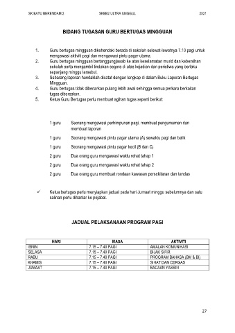 1. Guru bertugas mingguan dikehendaki berada di sekolah selewat-lewatnya 7.10 pagi untuk
