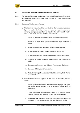9.2.2 Contents of the Handover Manual: b) This information shall be supplied for the JKR’s review in the following