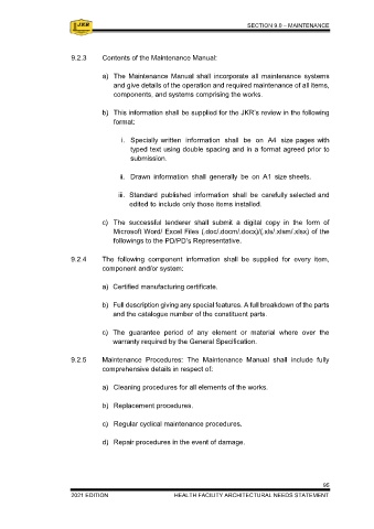 9.2 HANDOVER MANUAL AND MAINTENANCE MANUAL 9.2.3 Contents of the Maintenance Manual: