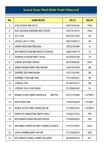 Senarai Nama Murid Hadir Penuh Tahun 2018
