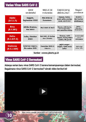 Varian Virus SARS CoV-2 Sumber : corona.jakarta.go.id Virus SARS CoV-2 Bermutasi Adanya varian baru virus SARS CoV-2 karena kemampuannya dalam bermutasi. Bagaimana virus SARS CoV-2 bermutasi? simak video berikut ini! 10