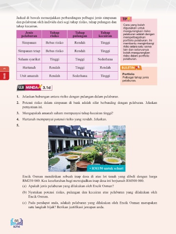 (b) Nyatakan potensi risiko, pulangan dan kecairan atas pelaburan yang dilakukan oleh