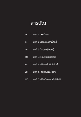 สารบัญ 14 ❘ บทที่ 1 จุดเริ่มต้น ั 34 ❘ บทที่ 2 สงครามศกดิ์สทธิ์ ิ 48 ❘ บทที่ 3 วีรบุรุษผู้กอบกู้ 60 ❘ บทที่ 4 วีรบุรุษแห่งซีเรีย ิ 76 ❘ บทที่ 5 พชิตแผ่นดินอียิปต์ 98 ❘ บทที่ 6 สลต่านผู้ยิ่งใหญ่ ุ 120 ❘ บทที่ 7 พชิตดินแดนศกดิ์สทธิ์ ิ ิ ั