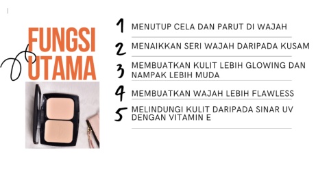 1 MENUTUP CELA DAN PARUT DI WAJAH FUNGSI 2 MENAIKKAN SERI WAJAH DARIPADA KUSAM UTAMA 3 MEMBUATKAN KULIT LEBIH GLOWING DAN NAMPAK LEBIH MUDA 4 MEMBUATKAN WAJAH LEBIH FLAWLESS 5 MELINDUNGI KULIT DARIPADA SINAR UV DENGAN VITAMIN E