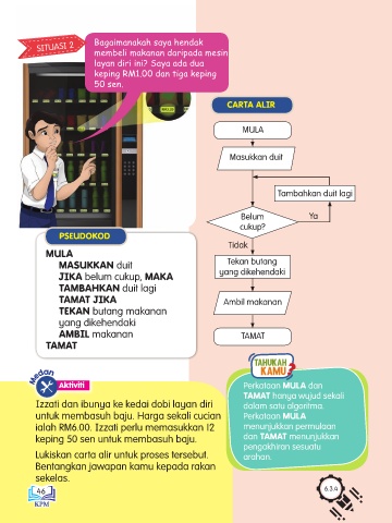Izzati dan ibunya ke kedai dobi layan diri dalam satu algoritma.