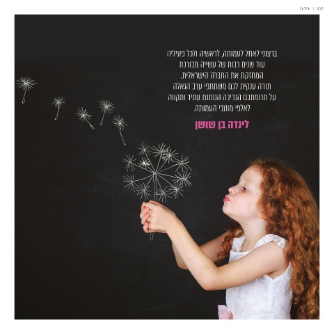 | 102יהלום ברצוני לאחל לעמותה ,לראשיה ולכל פעיליה עוד שנים רבות של עשייה מבורכת המחזקת את החברה הישראלית. תודה ענקית לכם משתתפי ערב הגאלה על תרומתכם הנדיבה הנותנת עתיד ותקווה לאלפי מוטבי העמותה. לינדה בן שושן