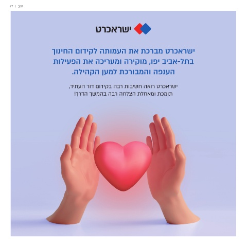 זהב | 77 ישראכרט מברכת את העמותה לקידום החינוך בתל-אביב יפו ,מוקירה ומעריכה את הפעילות הענפה והמבורכת למען הקהילה. ישראכרט רואה חשיבות רבה בקידום דור העתיד, תומכת ומאחלת הצלחה רבה בהמשך הדרך!